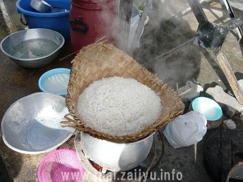 かごに入れて炊くお米は、イーサン料理でおなじみの調理方法で、炊きたてのおいしいお米を食べることができます。