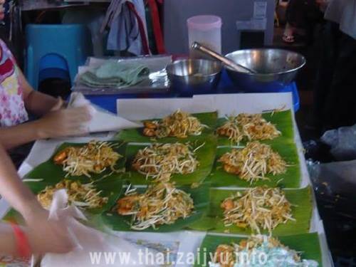 バナナの木の皮で包むこの屋台では、番号札を配るほどの人気店で、バンコク随一と評判のパッタイ屋台です。